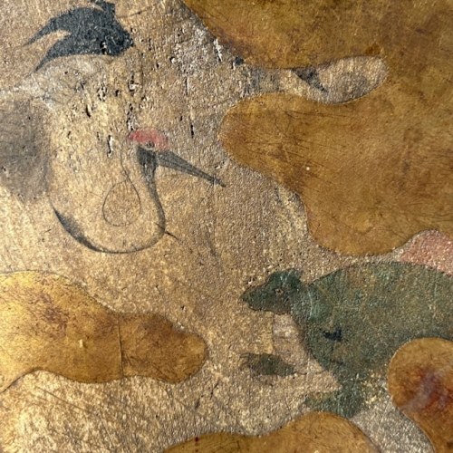 金蒔絵で雲、色絵で鶴亀が描かれております、蒔絵の具合から江戸中期ごろではないかと思われます。